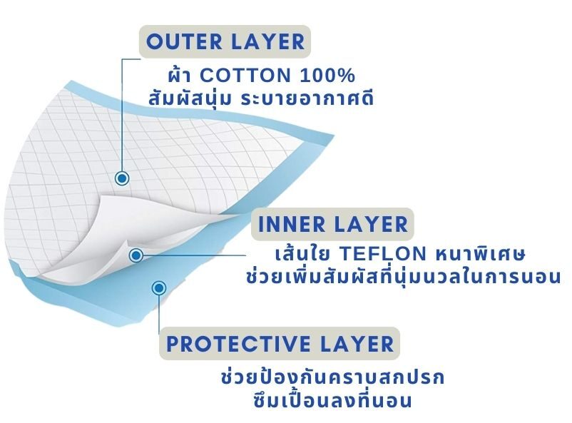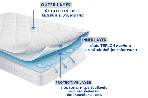 A: ผ้าปูที่นอนกันน้ำ 100% มีคุณสมบัติพิเศษที่ช่วยป้องกันของเหลวซึมลงสู่ที่นอน ช่วยปกป้องที่นอนของคุณจากคราบสกปรก และยังช่วยป้องกันไรฝุ่นกับเชื้อราได้ดีอีกด้วยครับ